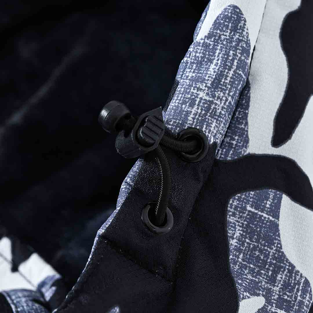 Adjustable and detachable hood with drawstring. Elastic cuffs with Velcro are effective keep wind and snow out.
